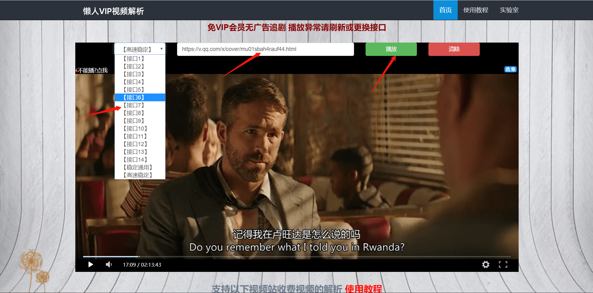 将复制好的链接粘贴至本站相应的位置,如下图标示处,点击播放即可免安装流畅播放了!如果无法正常播放或者播放卡顿请在左边下拉框选择其他解析线路,不同的线路接口清晰度以及播放体验均有差异请选最佳的接口使用即可!